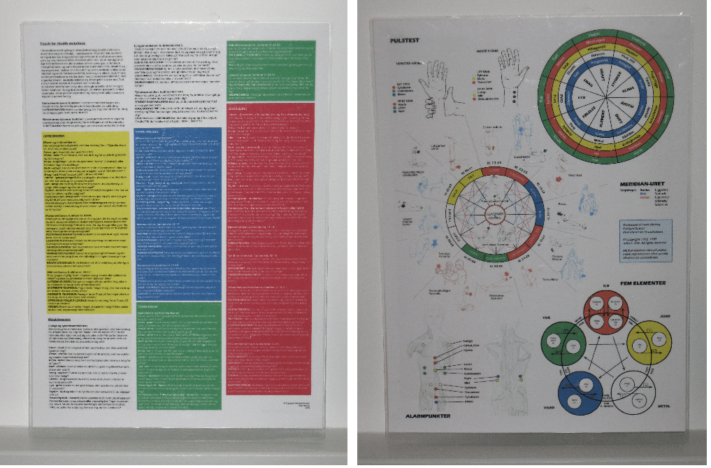 Plakatens ene side giver et hurtigt overblik over De 5 Elementer, metaforerne, alarmpunkter, teststillinger, pulsmetoden samt sheng- og co-cyklus.